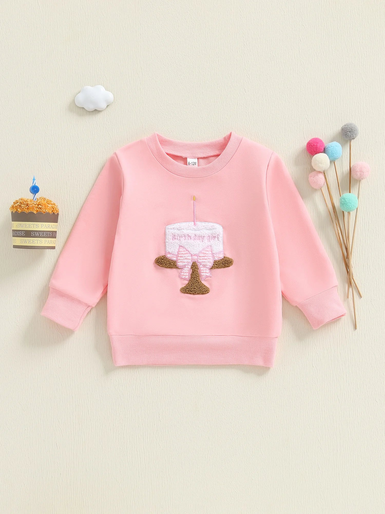 Adorable Infant Girls Birthday Hoodie Stylish Long Sleeve Cupcake Embroidered Round Neck Pullover Sweater Top