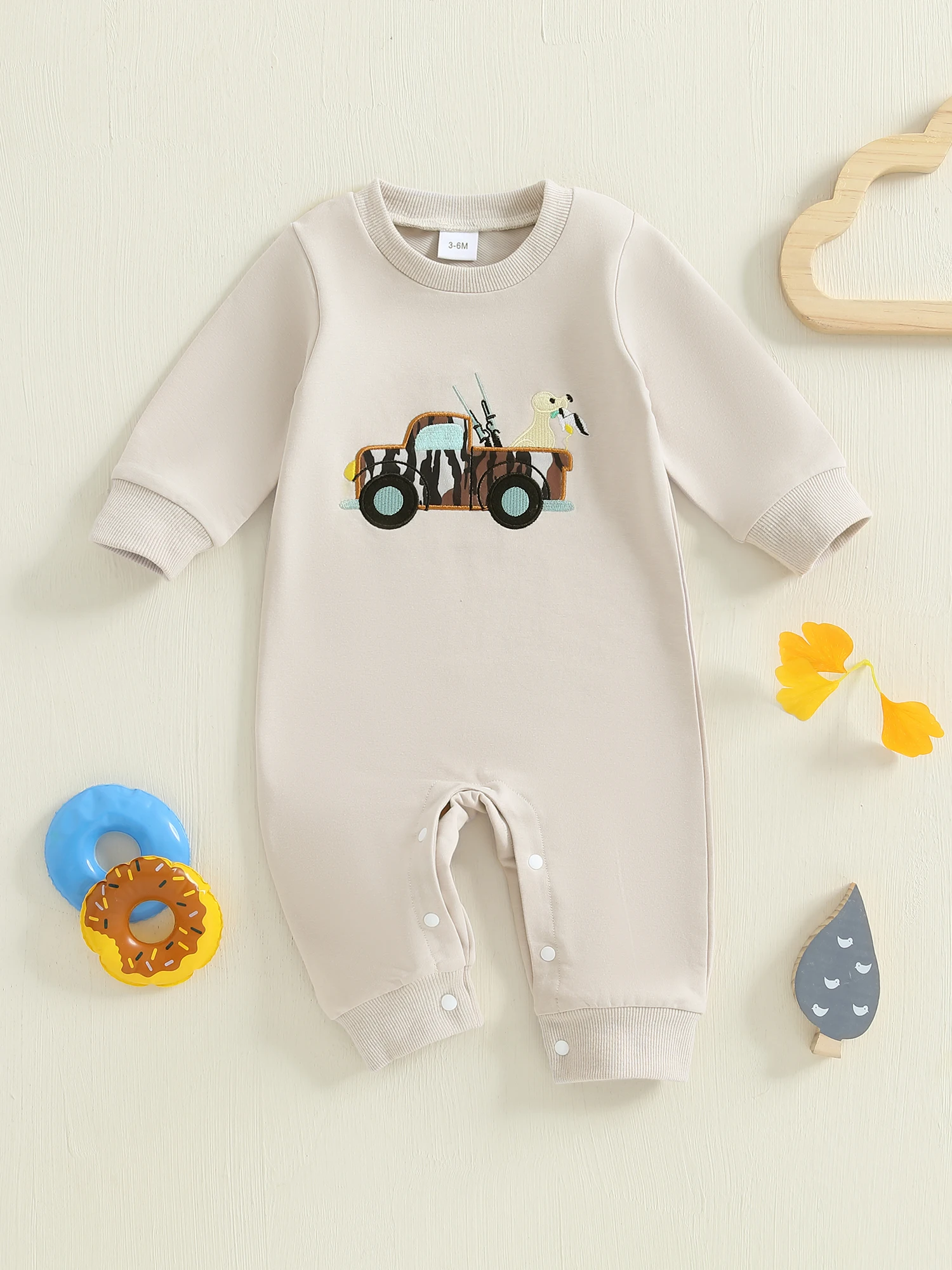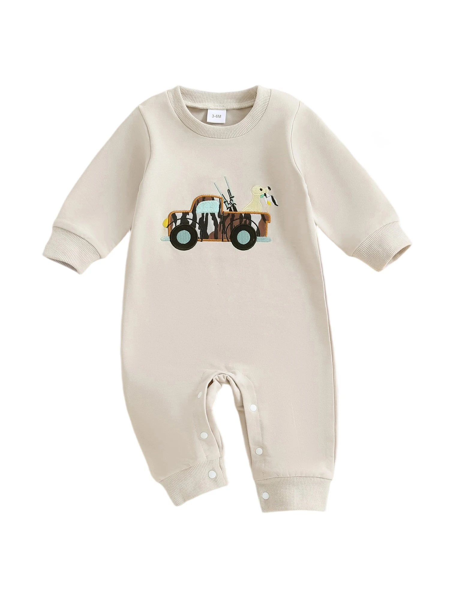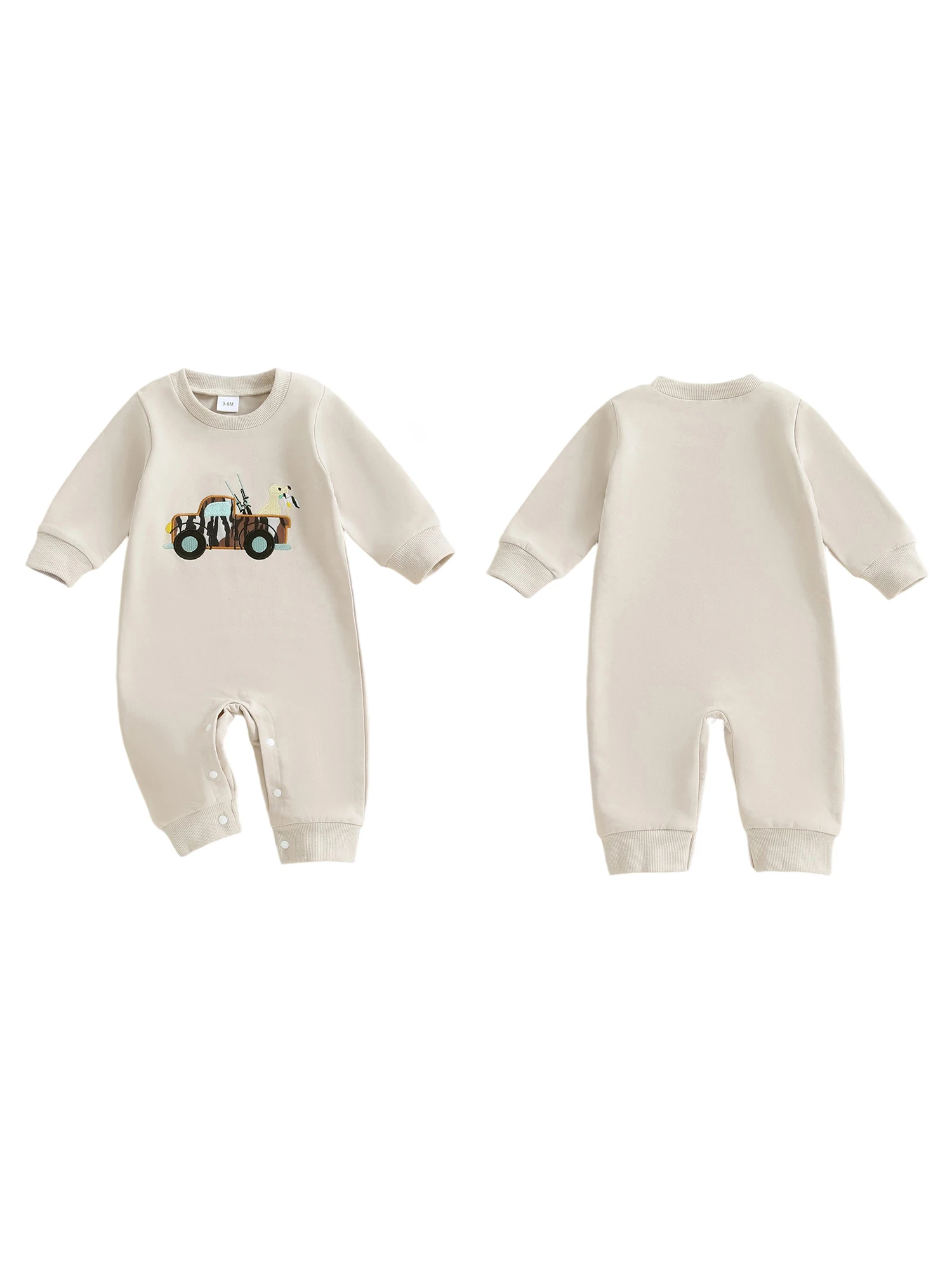 Baby Boy Fall Romper Loose Fit Animal/Truck Embroidered Crew Neck Long Sleeve Infant Boy Jumpsuit