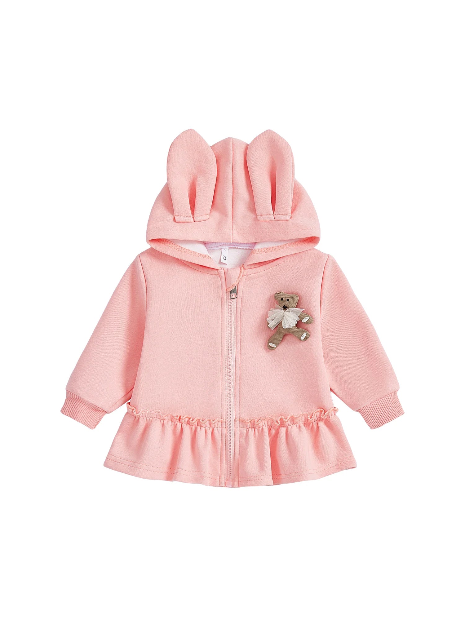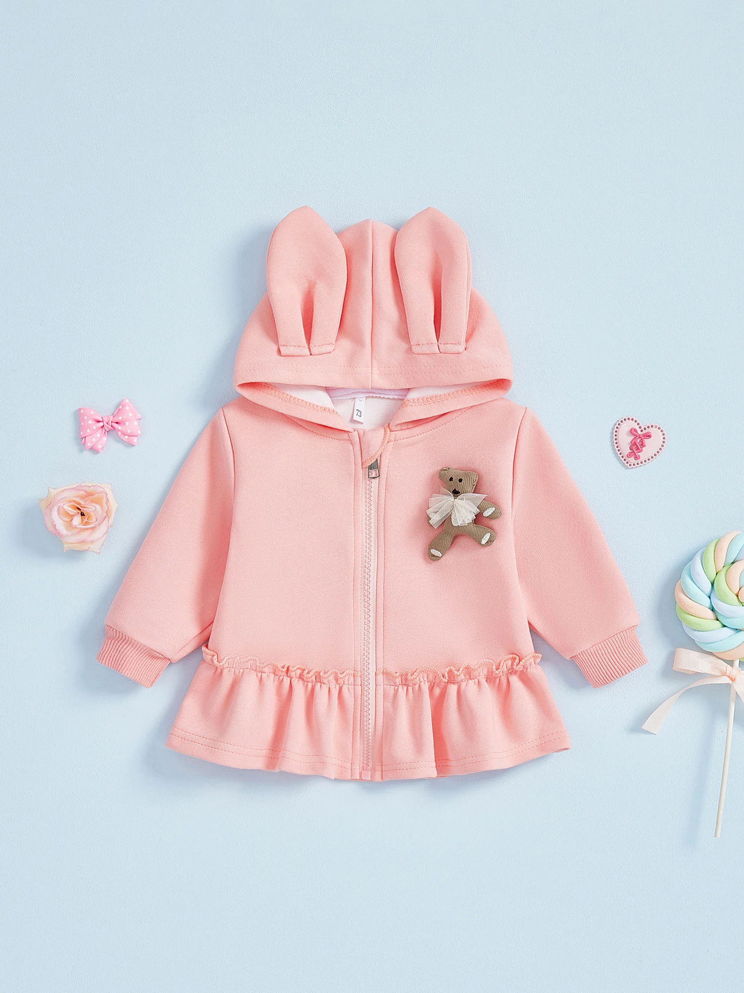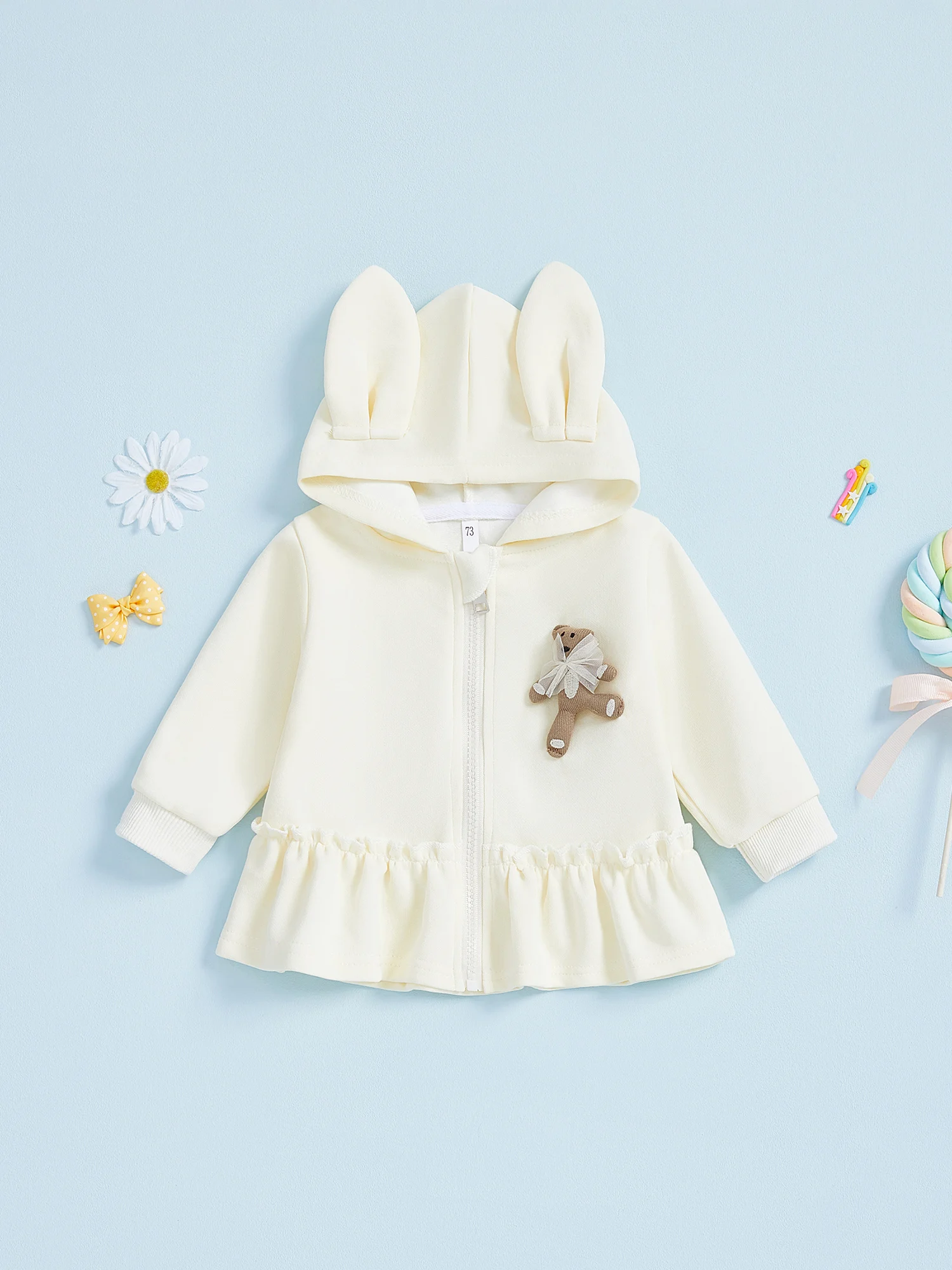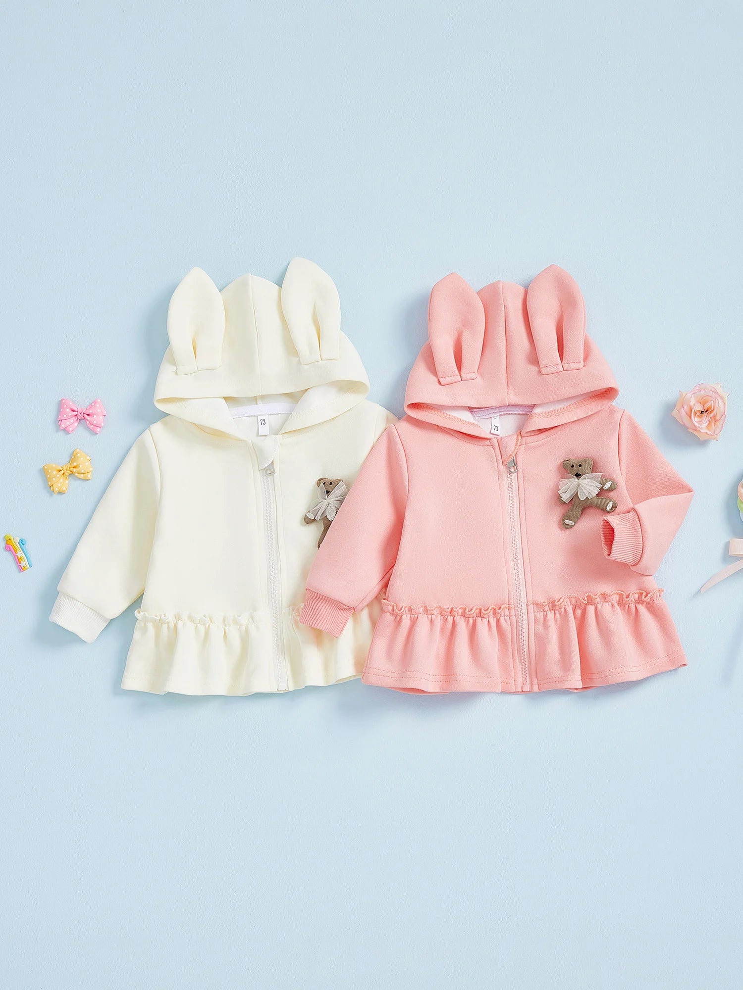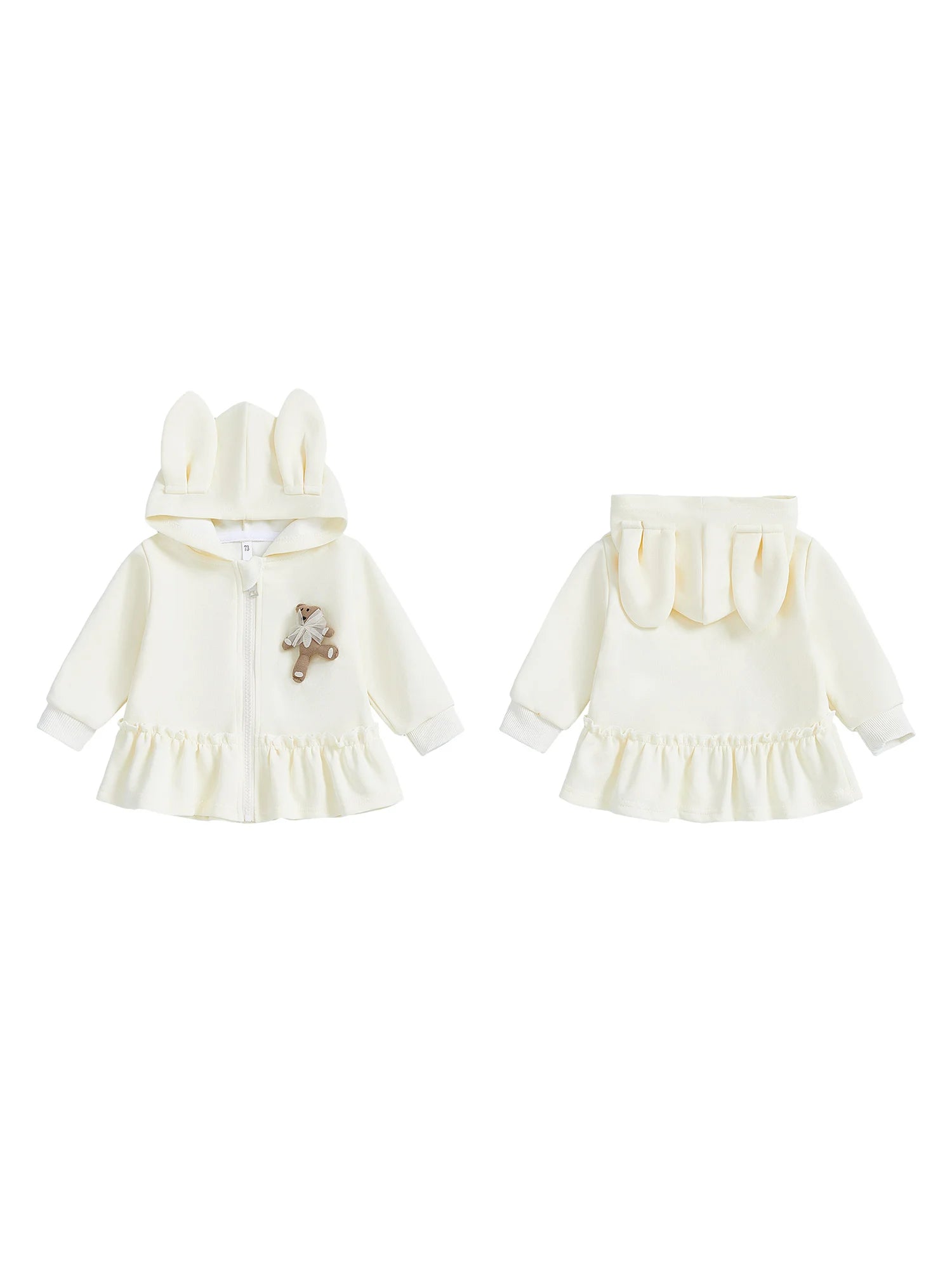 Toddler Girl Fall Jacket Long Sleeve Zip Up Ruffled Hem Hood Coat Cute Stuffef Animal Decor Warm Clothes