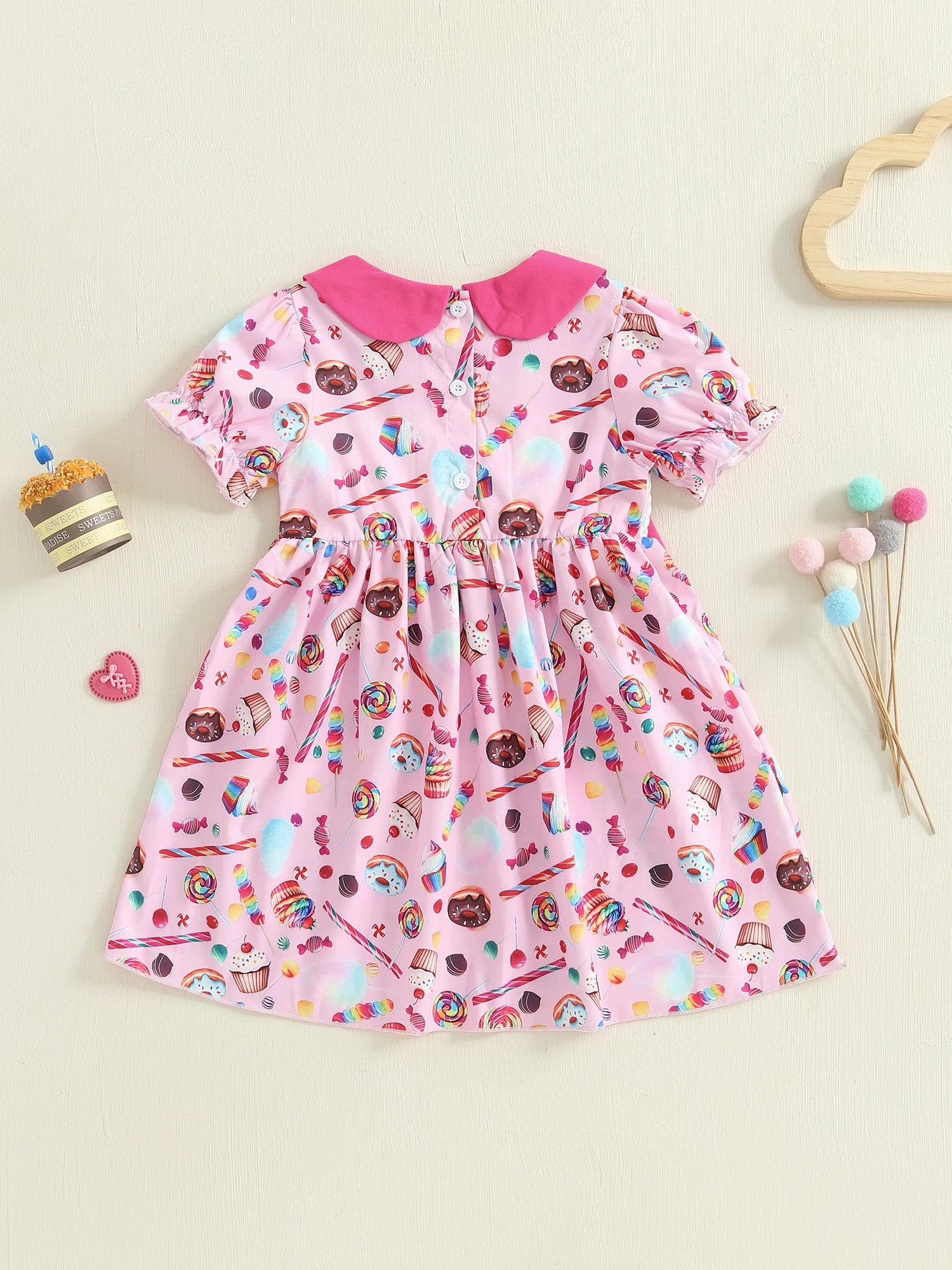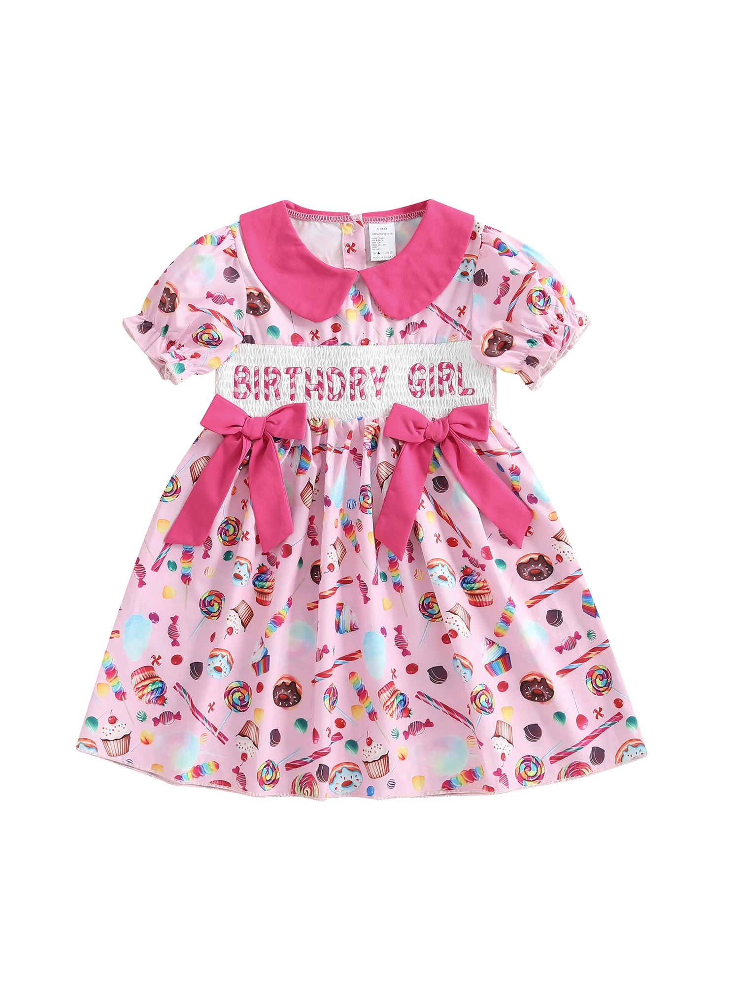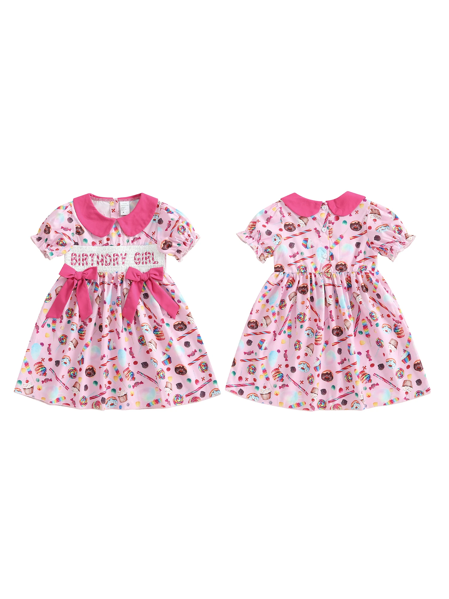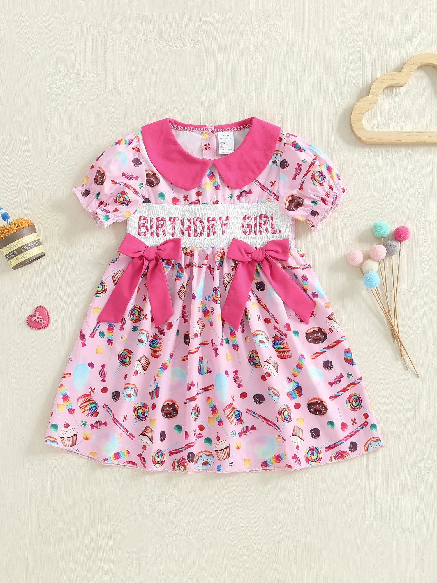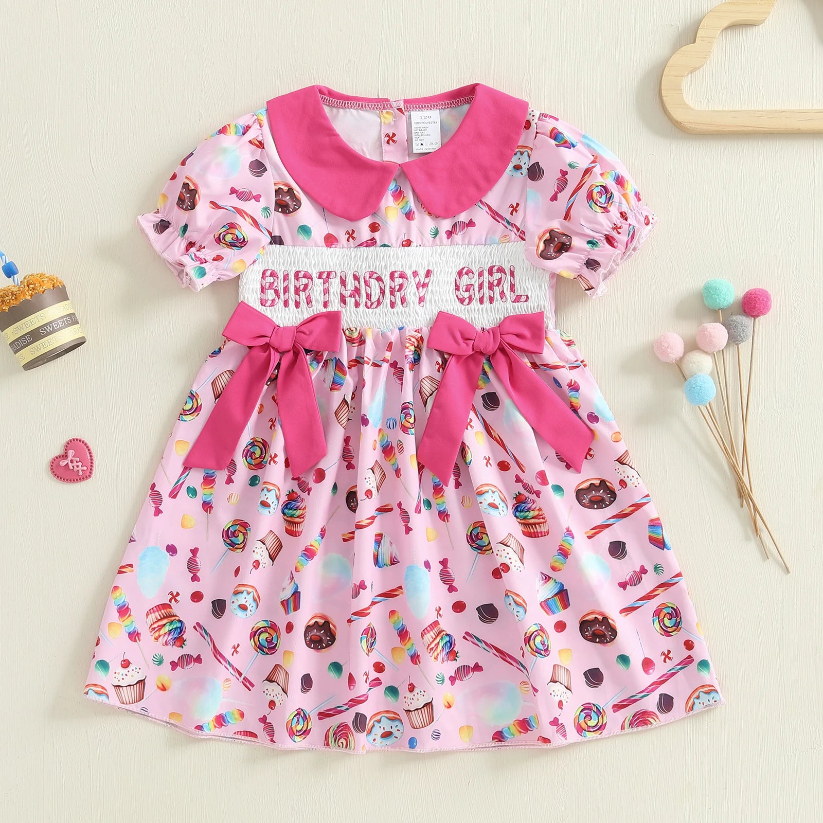 Kids Girls Dress, Short Sleeve Doll Collar Bows Dessert Print Embroidery Letters Summer Dress Birthday Clothes
