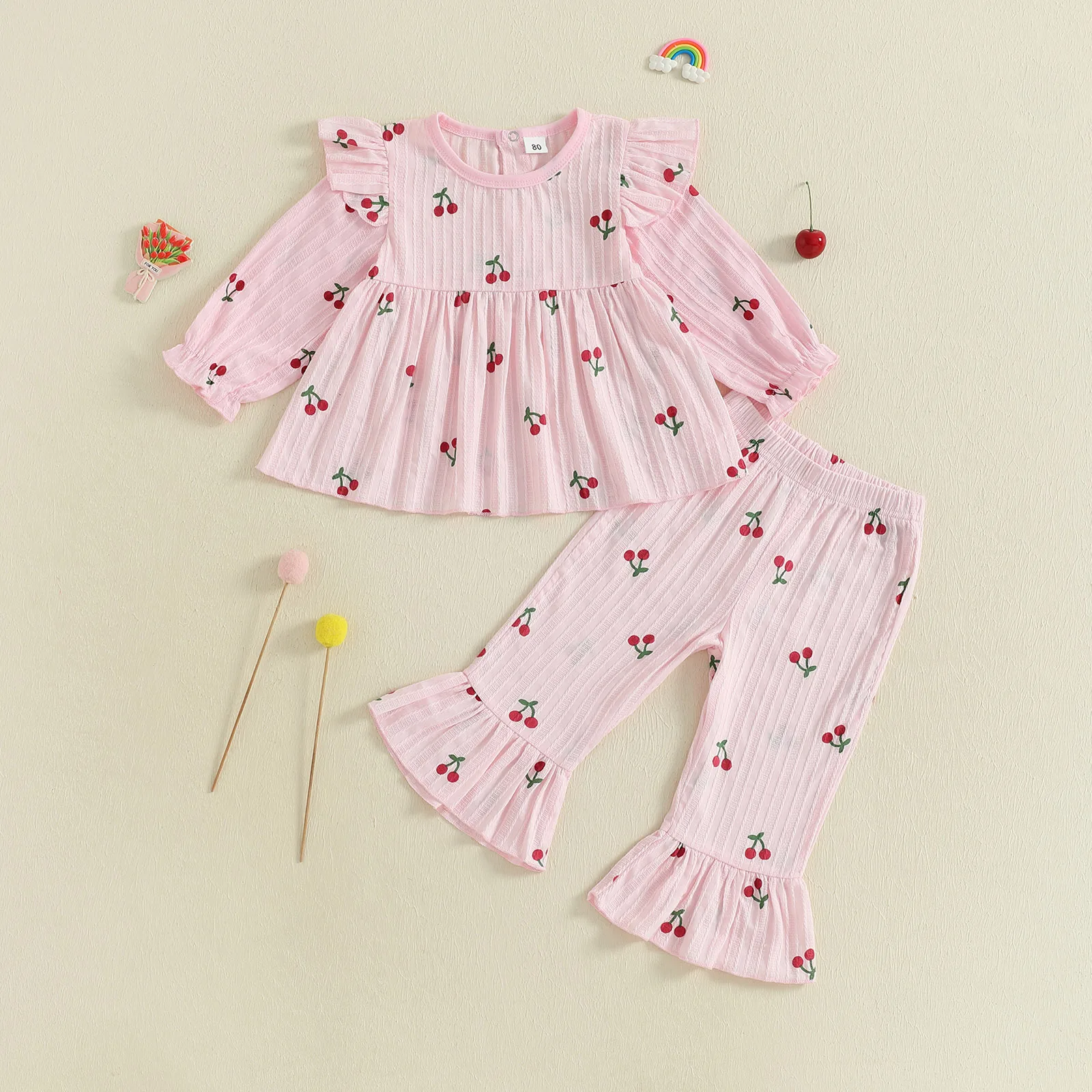 Toddler Girl Fall Outfits Cherry Print Long Sleeve Round Neck Pullover + Elastic Waist Flare Pants 2 Pcs Set