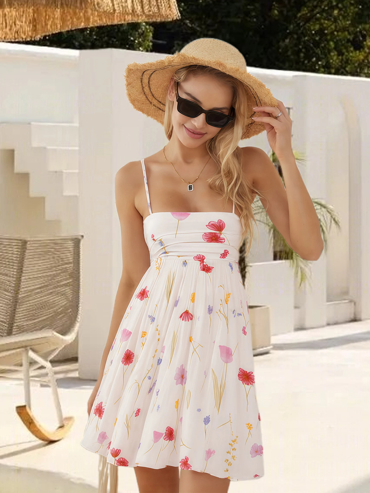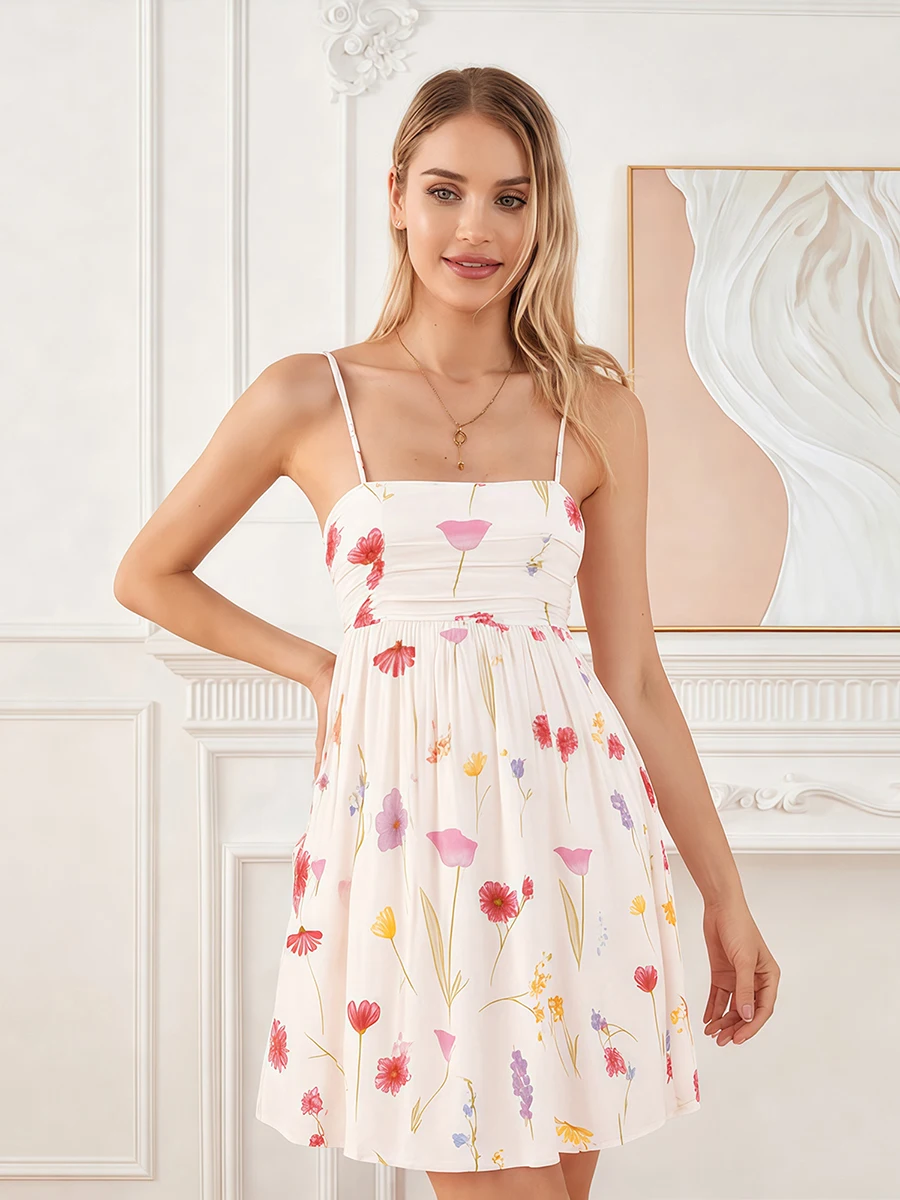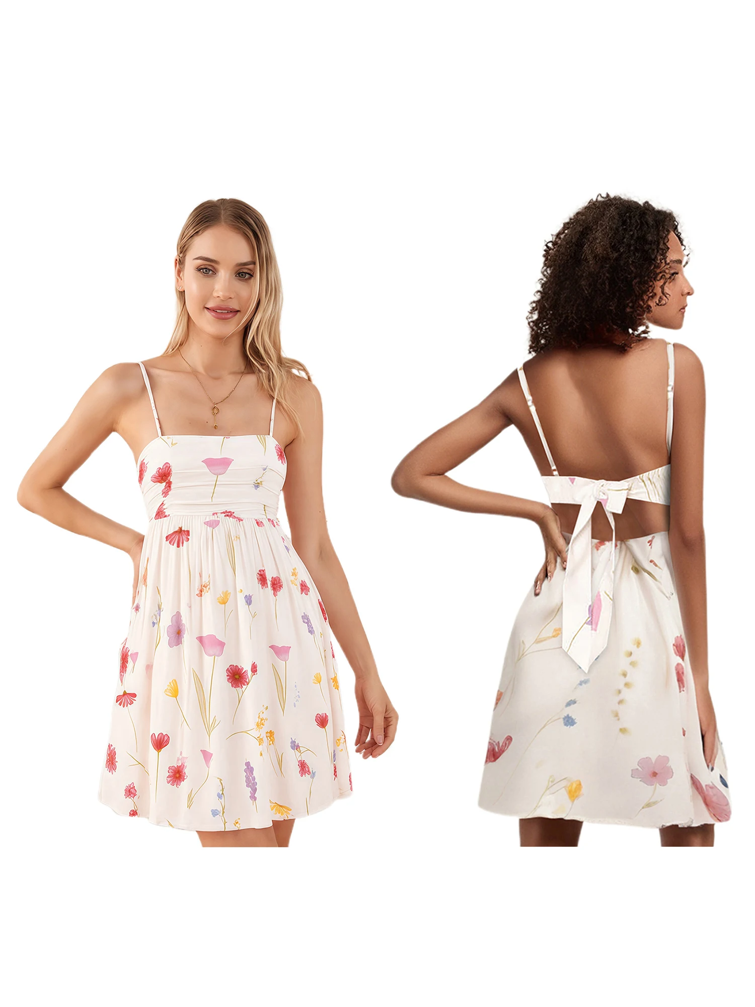 Floral print, tie up bow back, backless, ruched bust, adjustable spaghetti straps and sleeveless; Summer dresses for women; Beach dresses for women, A-line and mini length, make your legs longer