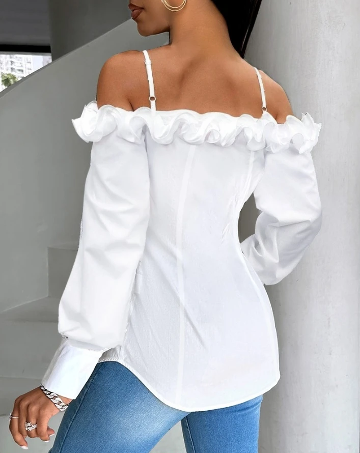Elegant Women's Shirt 2024 Summer White Ruffle Hem Buttoned Off Shoulder Spaghetti Strap Long Sleeve Slim Fit Blouse Top