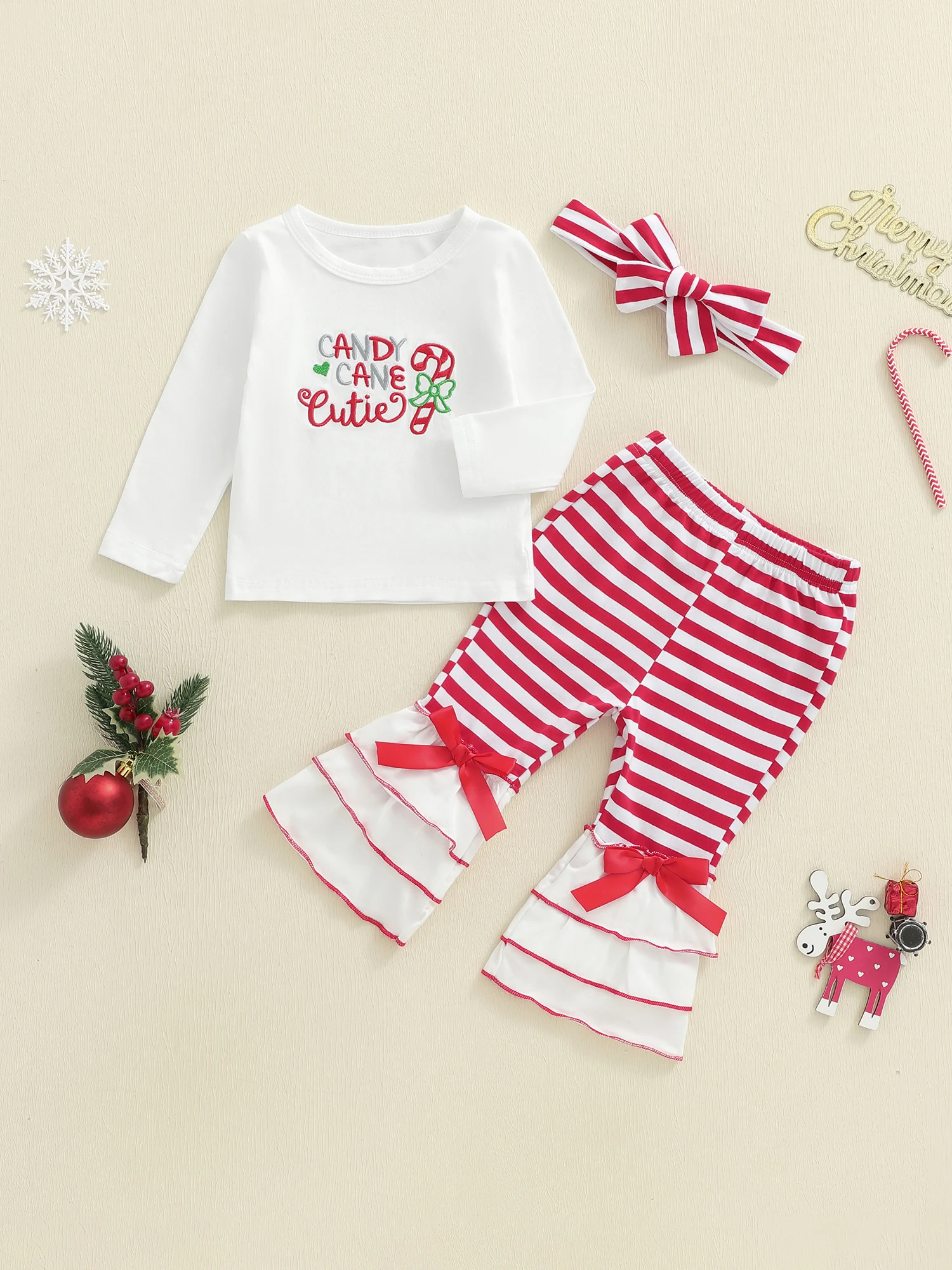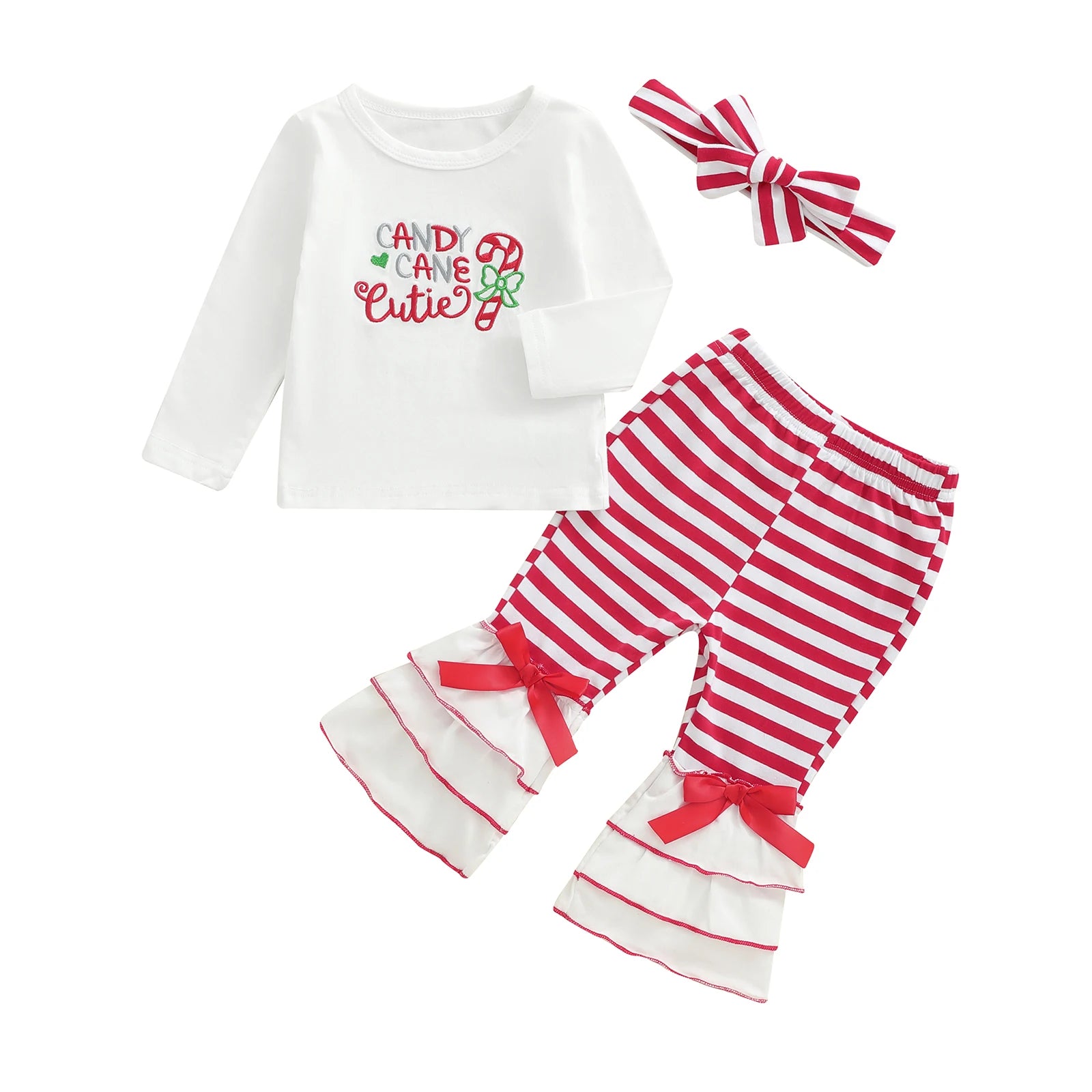 Toddler Girls Christmas Pants Sets Candy Cane Letter Embroidery Long Sleeve Tops Flared Pants Headband Set