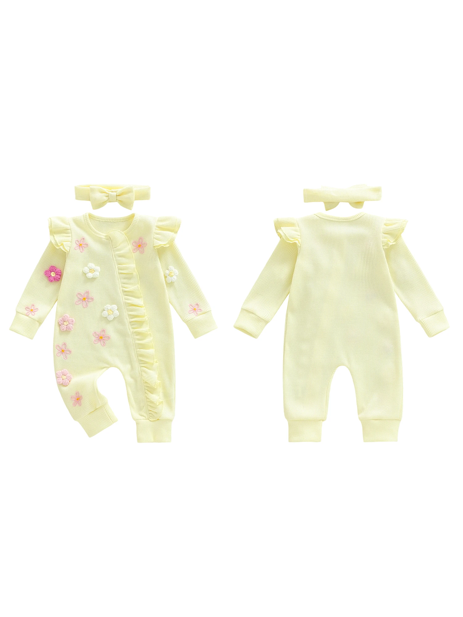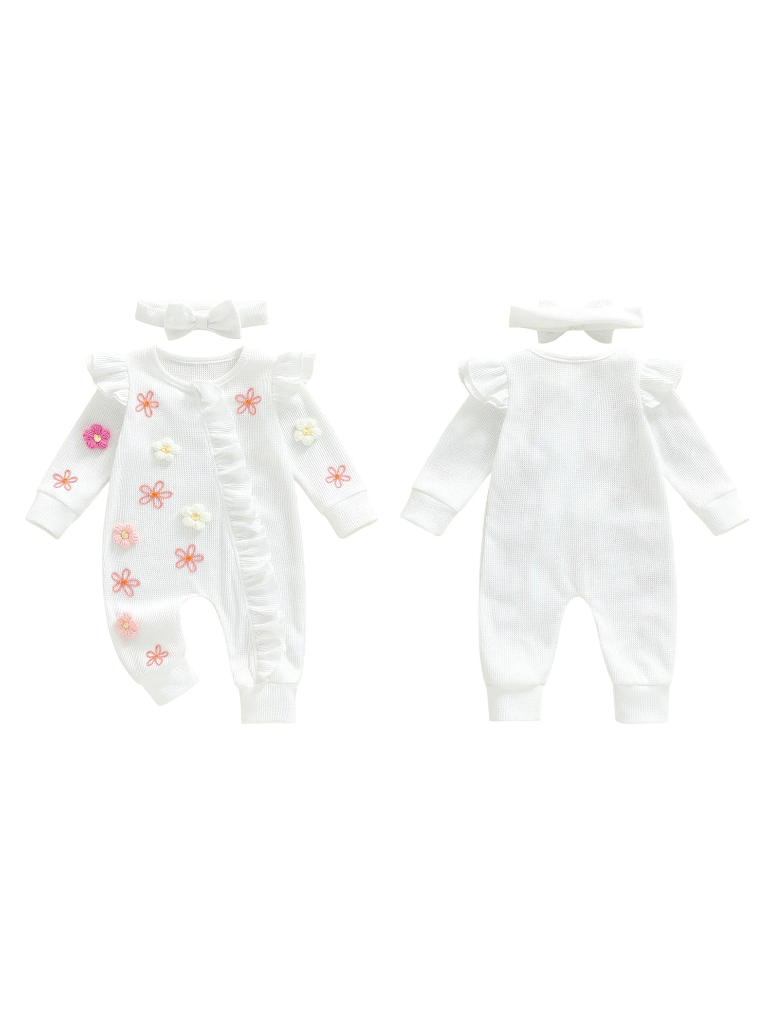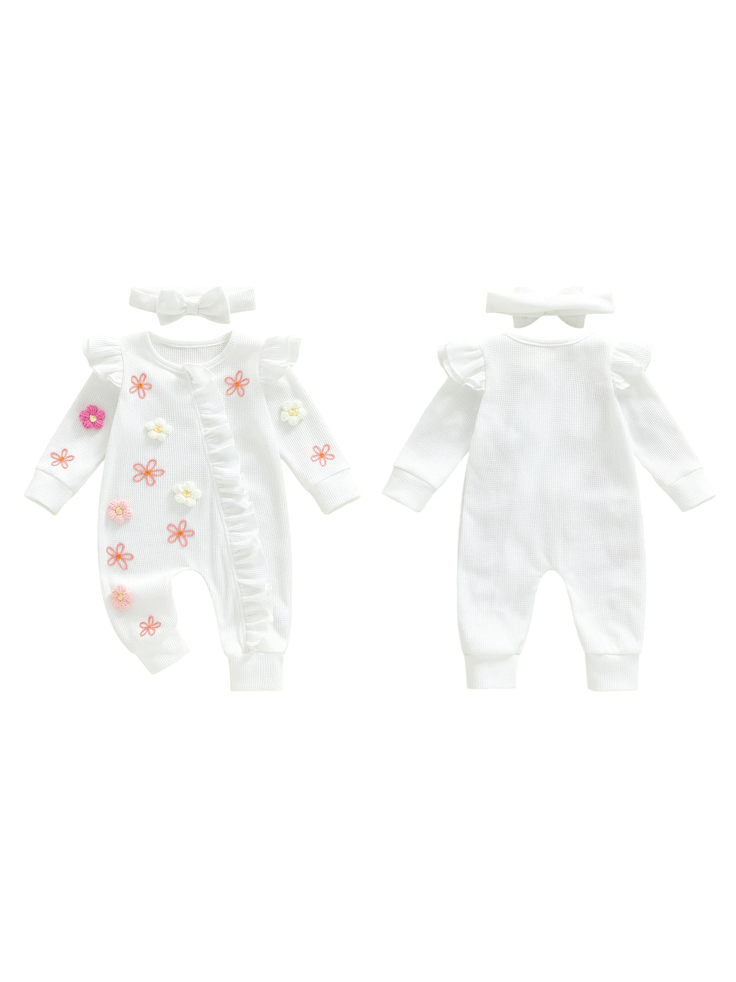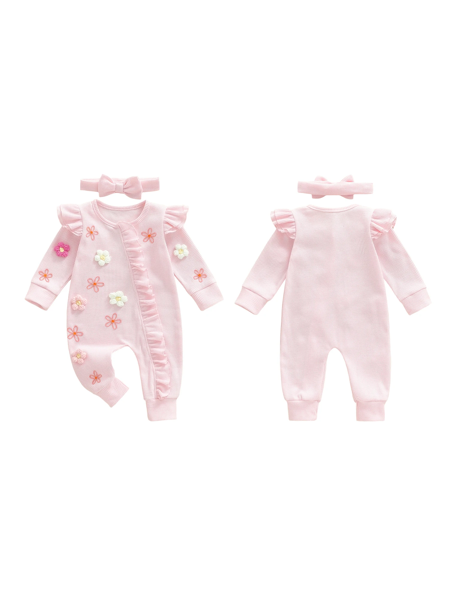 Baby Girl 2Pcs Fall Outfits Long Sleeve Round Neck 3D Flower Ruffle Jumpsuit with Headband Set