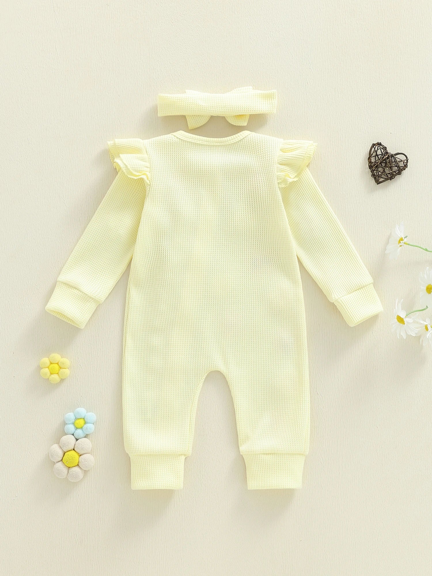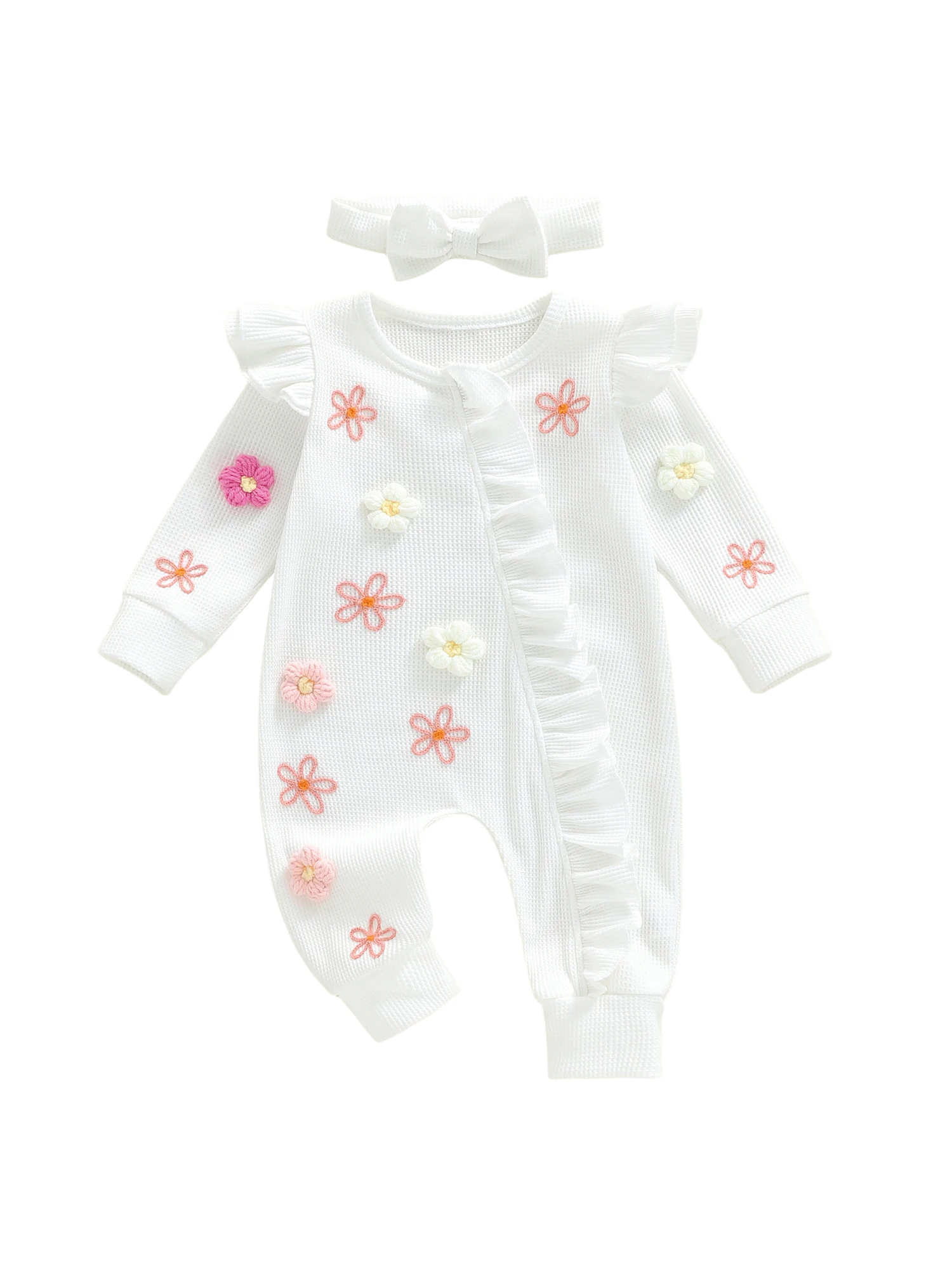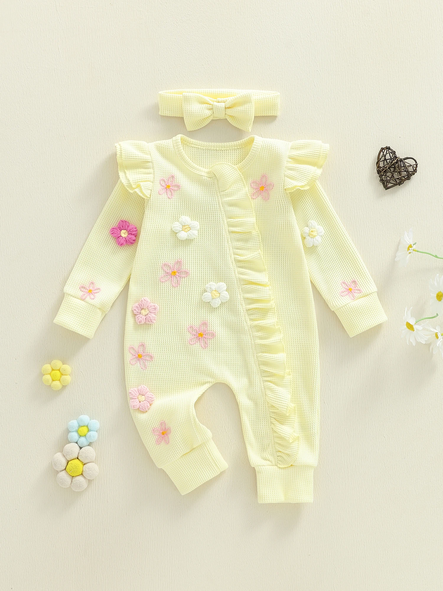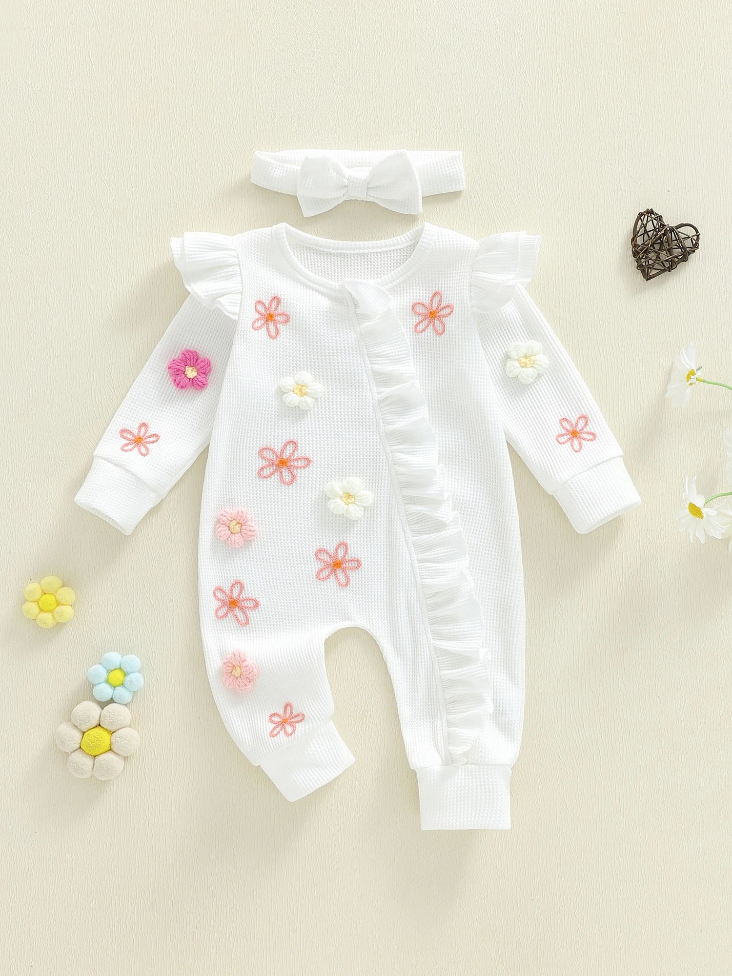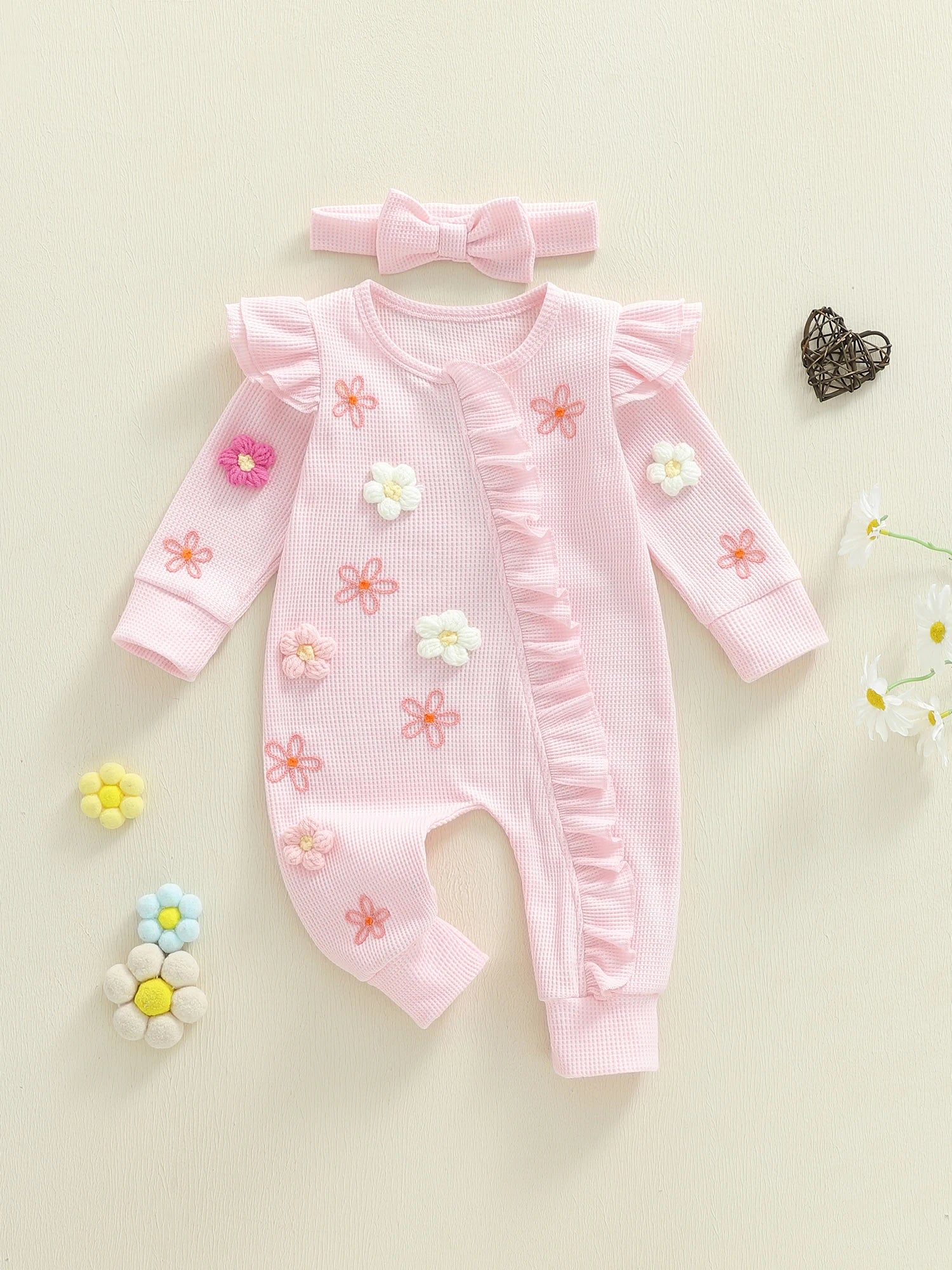 Baby Girl 2Pcs Fall Outfits Long Sleeve Round Neck 3D Flower Ruffle Jumpsuit with Headband Set