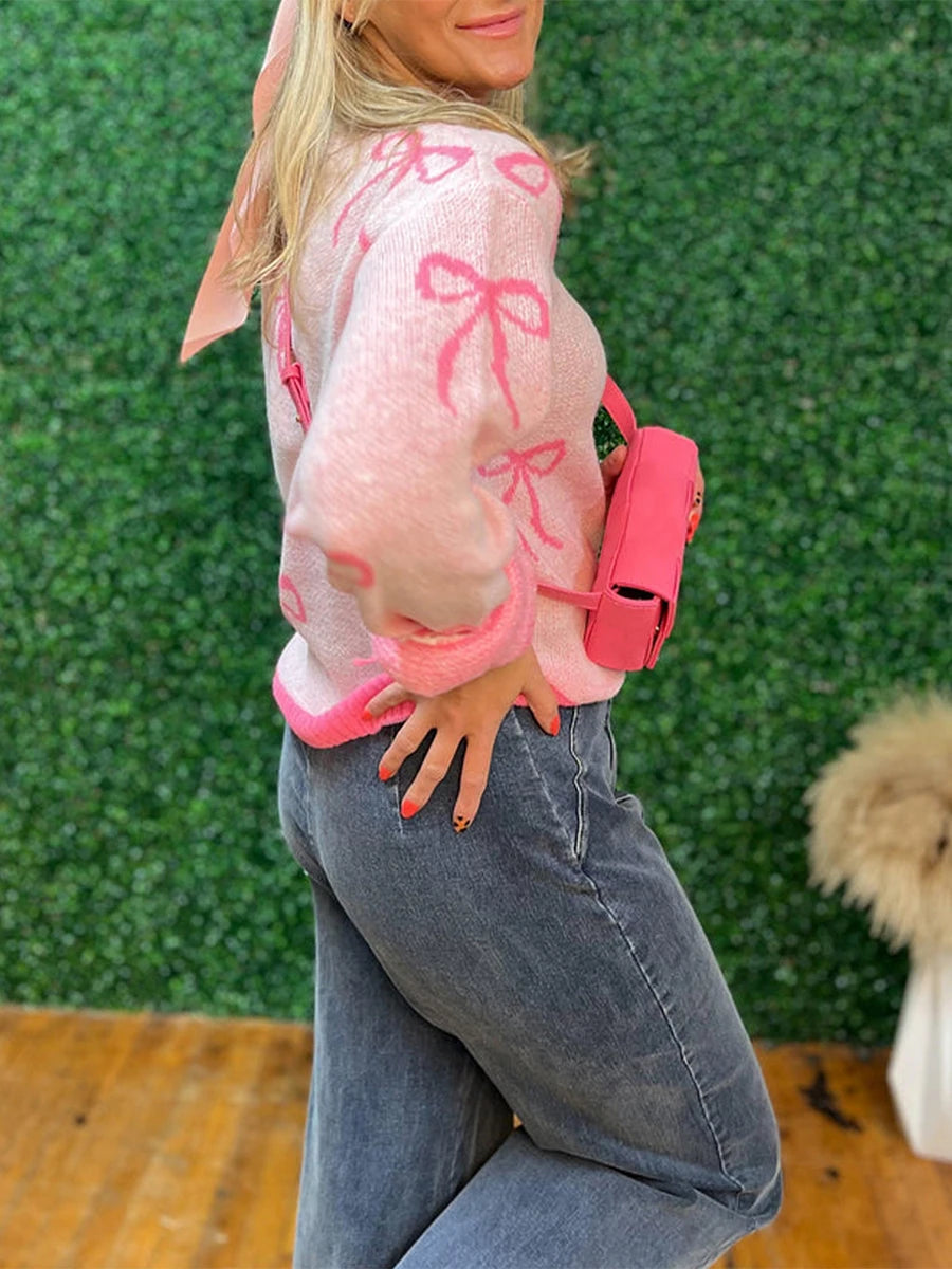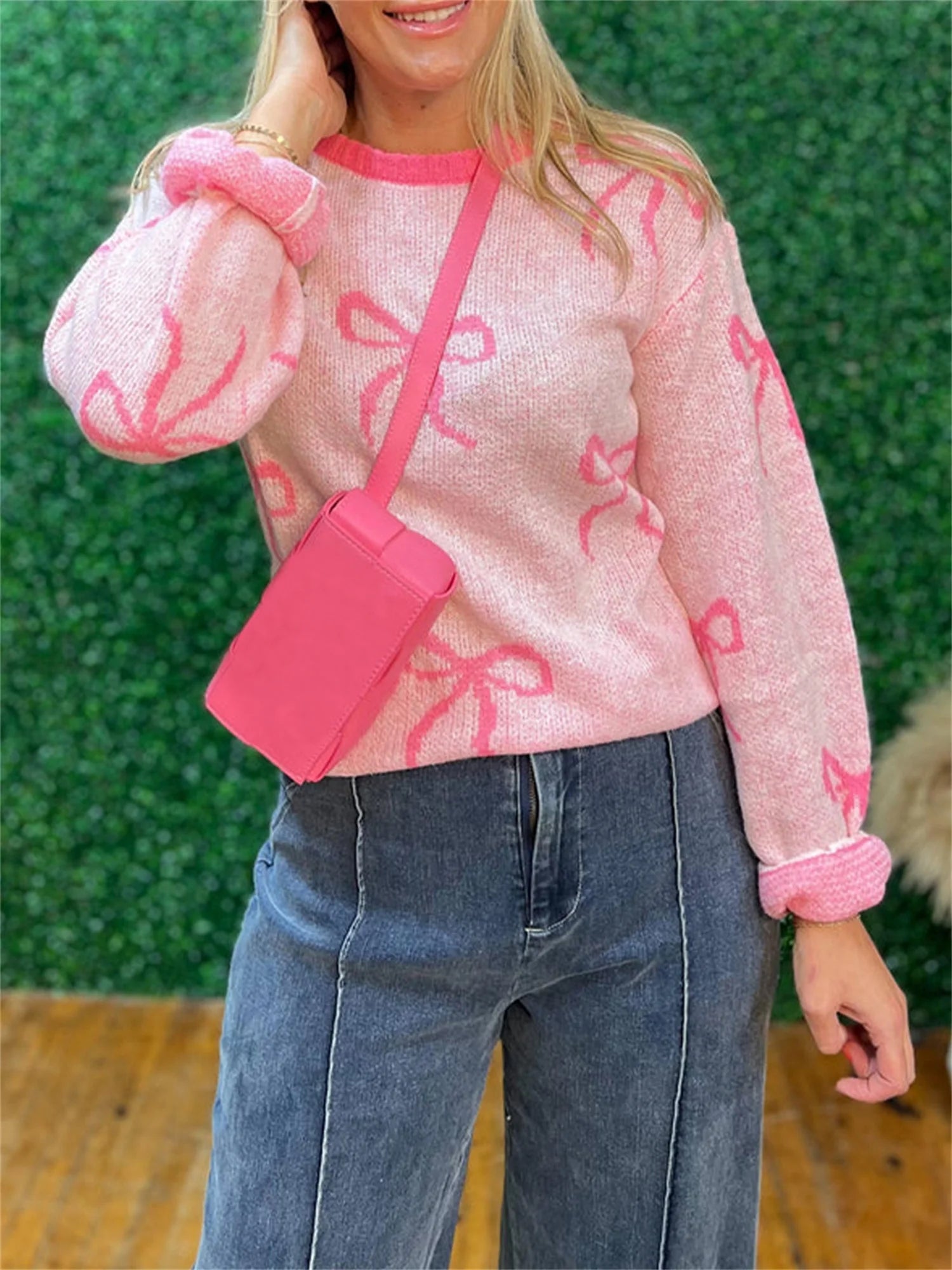 Women's Autumn Winter Knit Sweaters Long Sleeve Round Neck Bow Print Knitwear