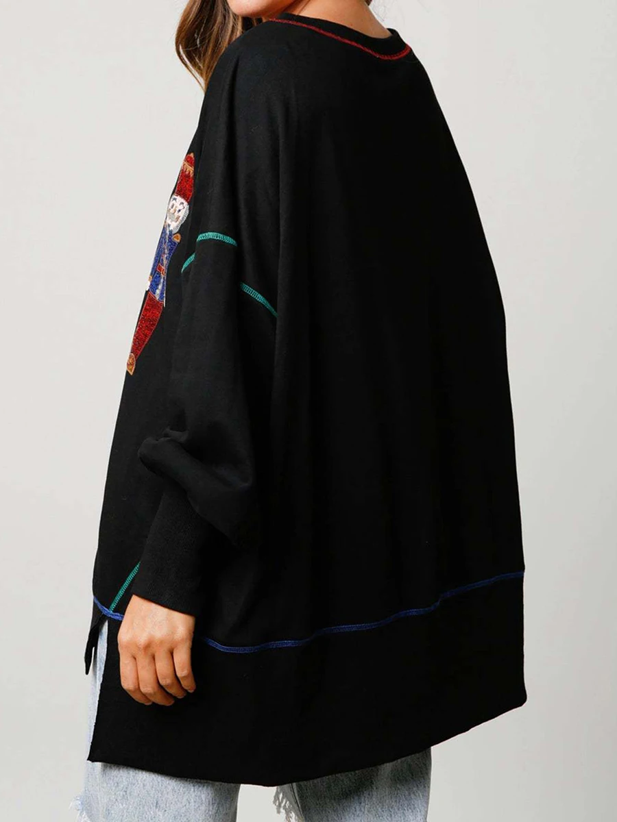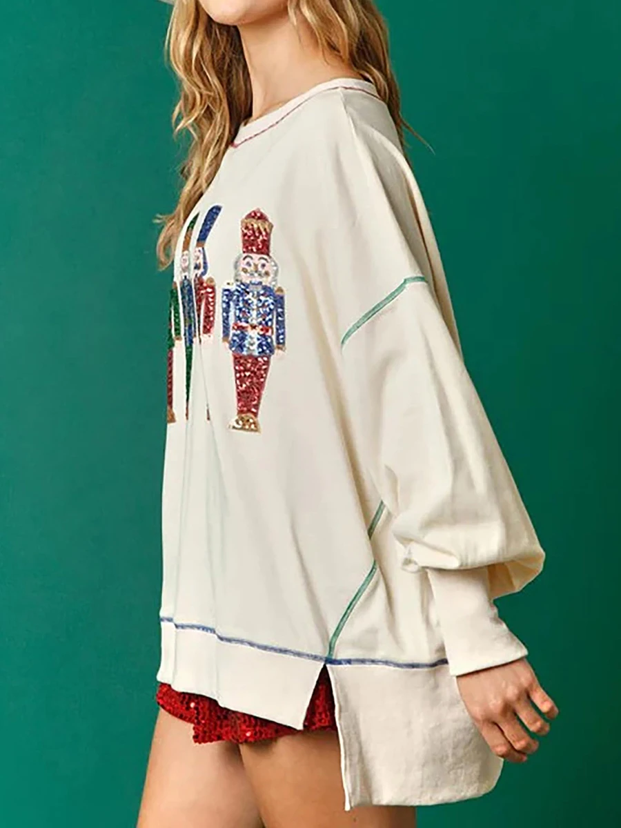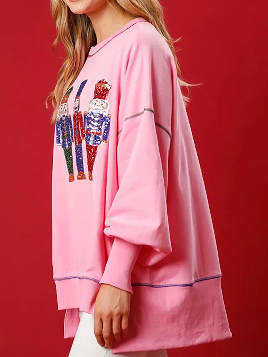 Women s Loose Sweatshirt Sequins Cartoon Person Crew Neck Long Sleeve Pullovers Fall Winter Casual Tops Shirts